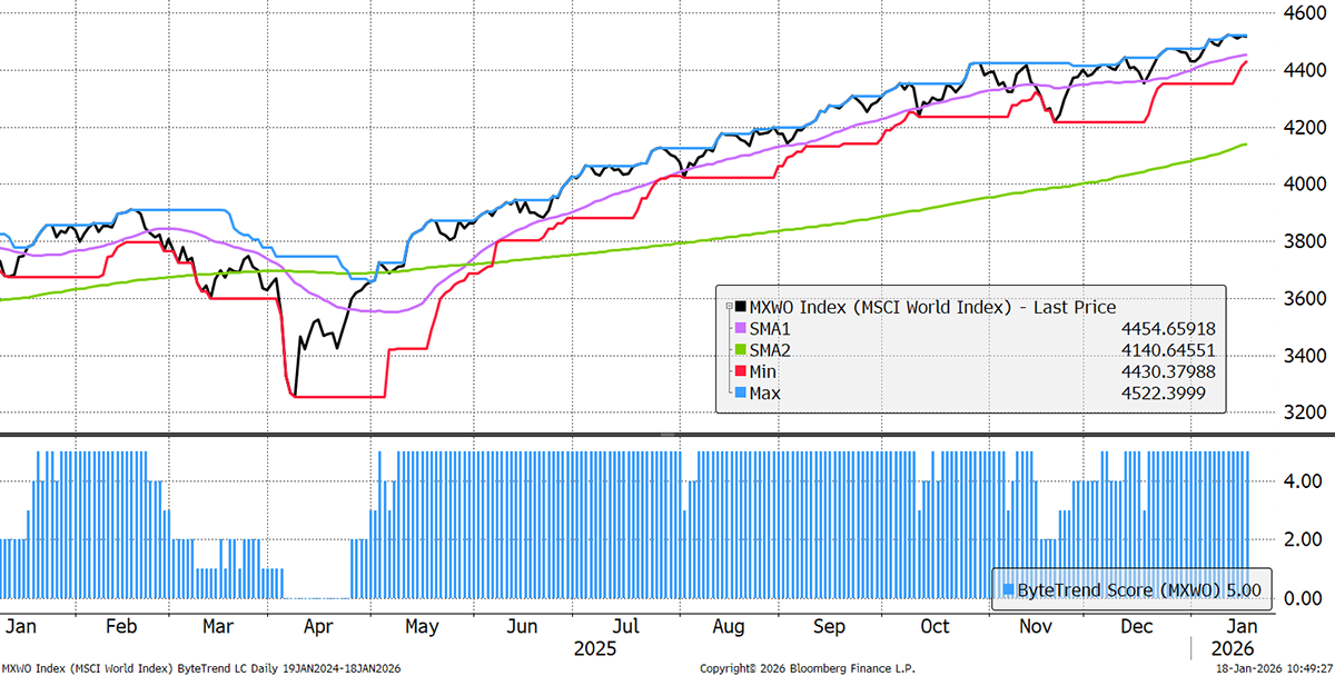The World Index retains a ByteTrend Score of 5 and makes another all-time high. The news over the weekend about Greenland and tariffs may have an impact this week.