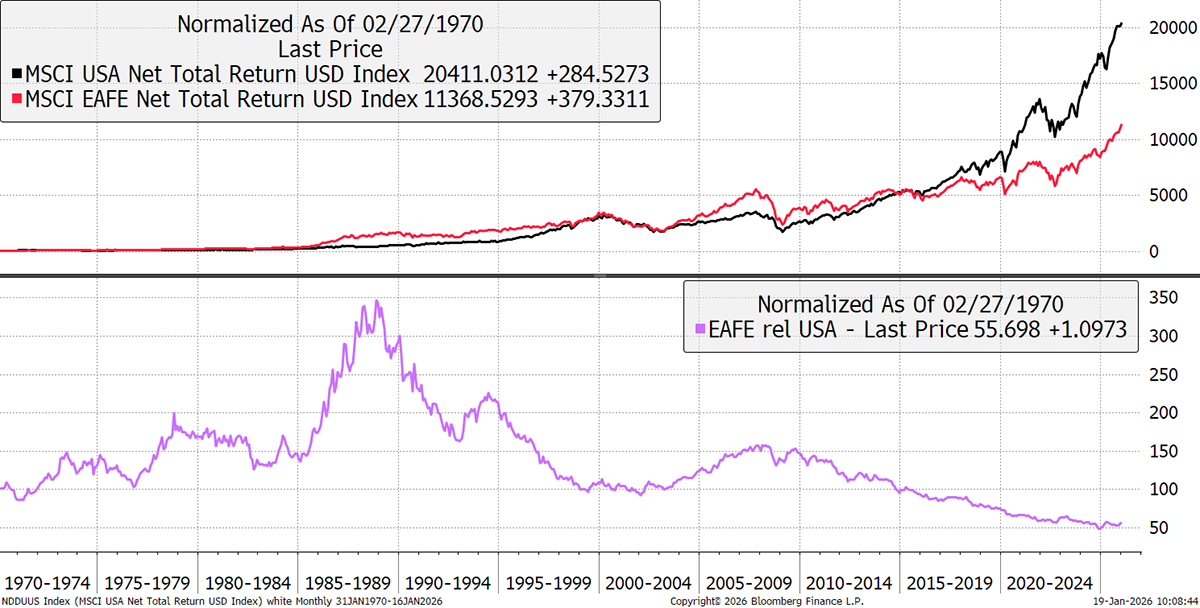 EAFE is the acronym for Europe, Australasia, and the Far East. Between 1970 and 1989, EAFE beat US stocks by 3.5x, the main driver being Japan. There was a spell of outperformance in the noughties, but that soon gave up. Since 1970, EAFE has delivered half the returns of US equities. The relative line (purple) has turned up, and a new era is upon us in global stockmarkets.