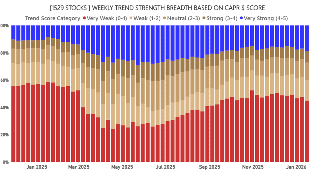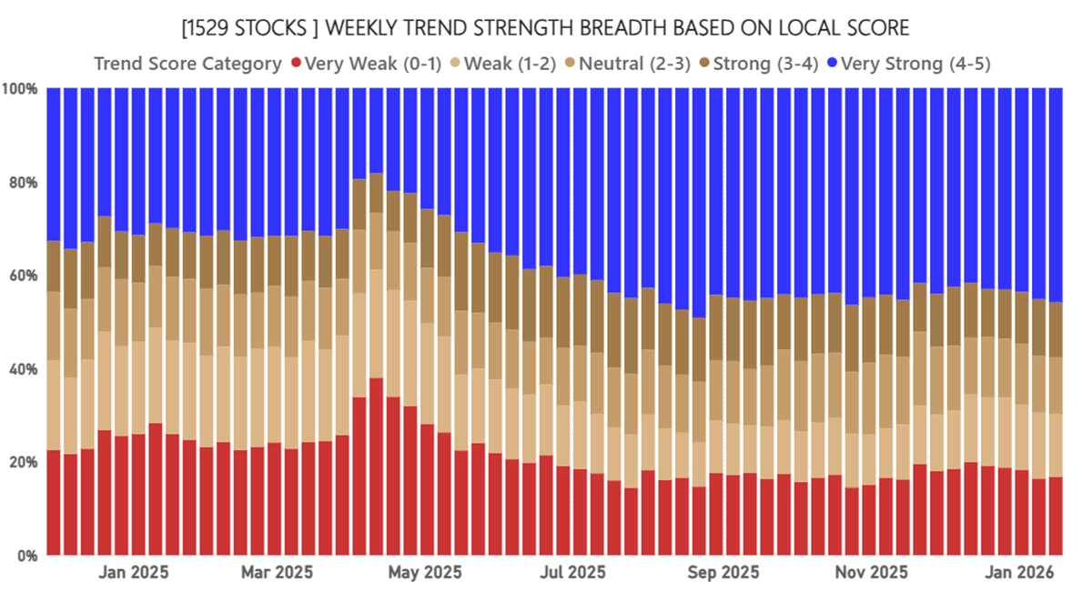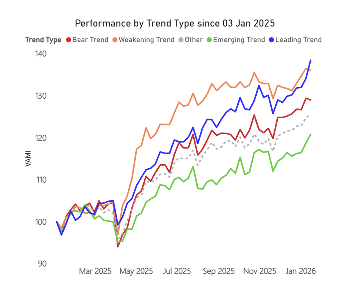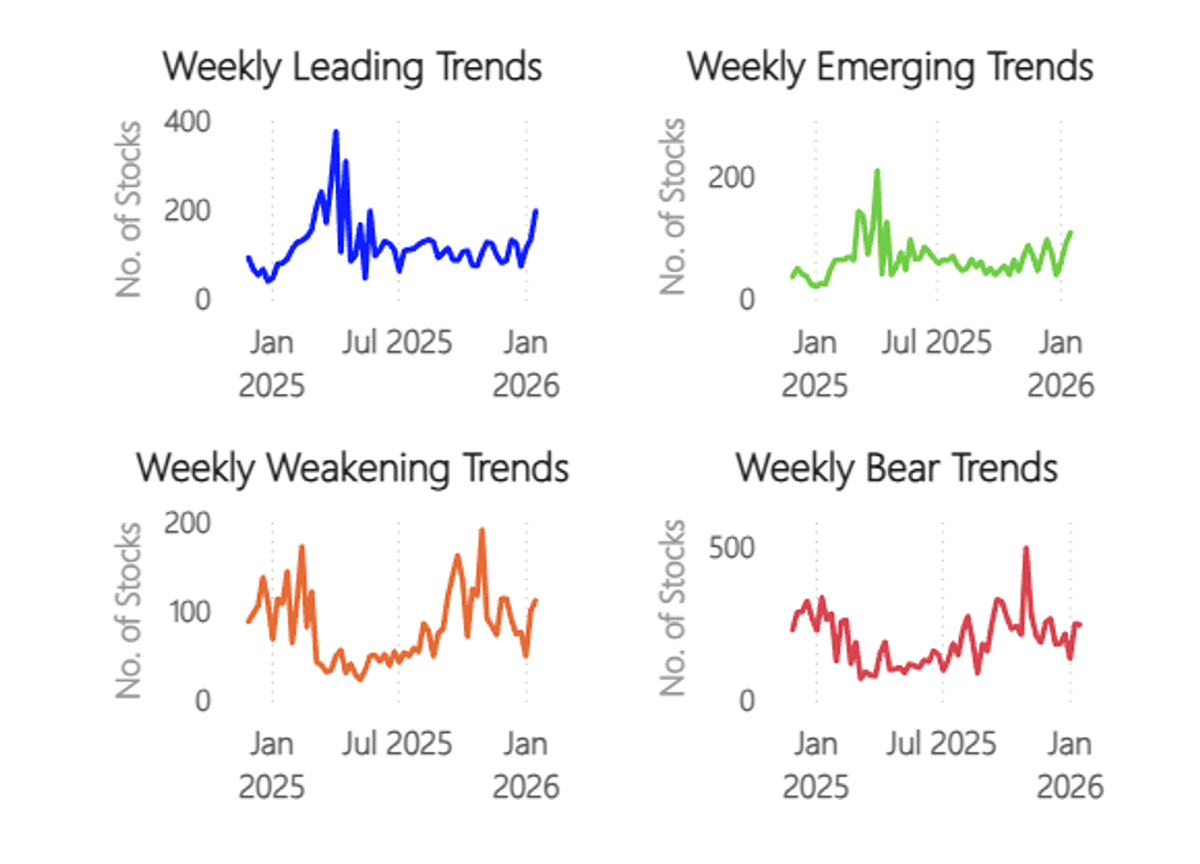 The leading trends are surging, and the emerging trends are picking up too. Weakening and bear trends have slowed.