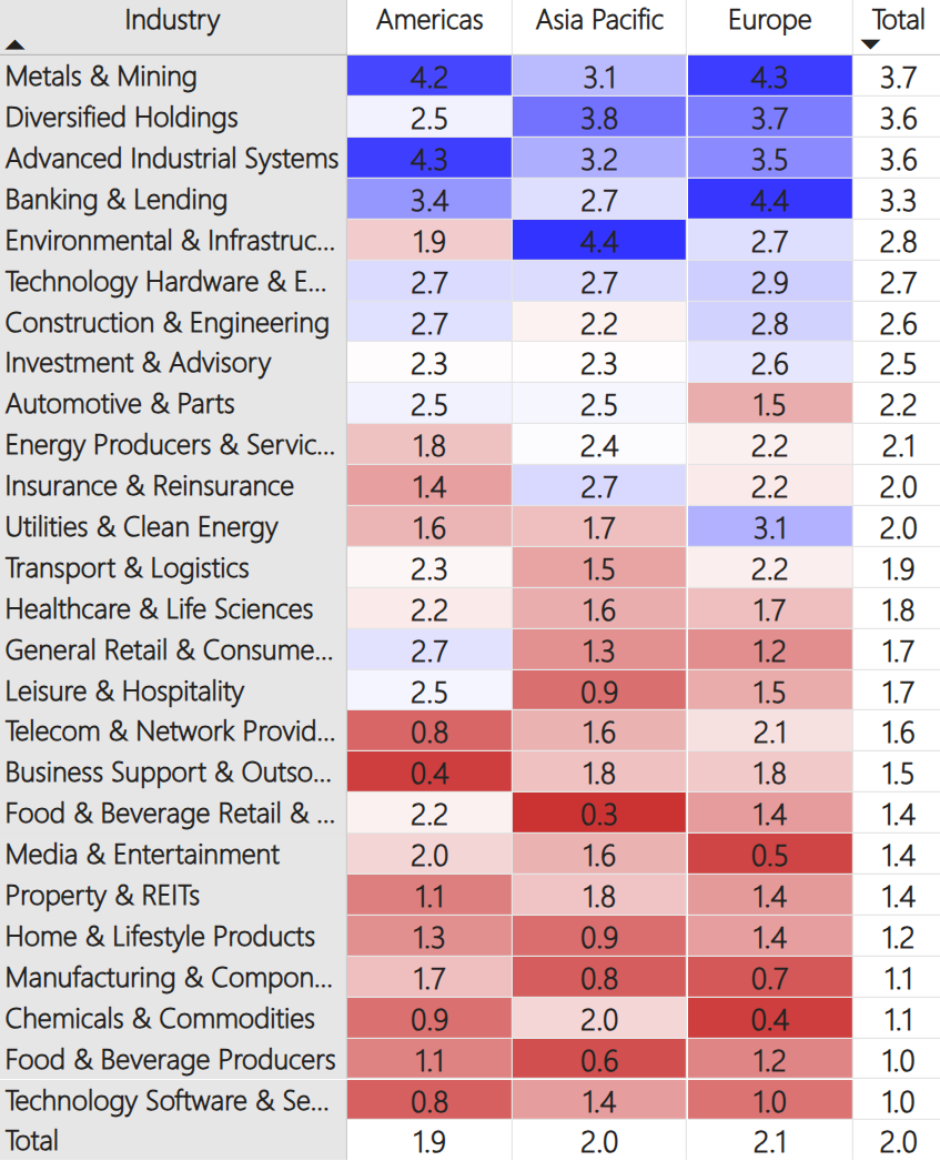 Tech Software now occupies the bottom slot, as investors flee the AI trade, despite no change in the fundamentals. Property and REITs rose across all regions, taking the average from 1.2 to 1.4. Falling rates will continue to benefit their recovery. Food & Beverage producers rose from 0.8 to 1.0.