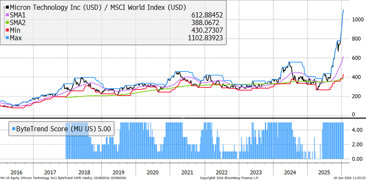 The shortage in memory chips, combined with the AI hype cycle, has created an astonishing rally in a small group of stocks, of which Micron is the leader. At 10x price-to-sales, it is nearly back to the record it set in August 2000 (12x). However, memory chips are famously cyclical, leading Micron to suffer four 50% crashes in the last decade alone.