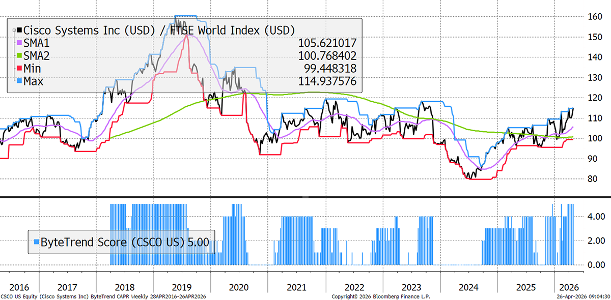 Cisco only surpassed its dotcom bubble peak price in 2025 – a quarter century later. It has been strong because it directly benefits from the AI networking story: hyperscaler demand, bigger AI orders, and raised guidance have strengthened the growth case. This has been backed by steady cash flows, as margins have expanded on double-digit sales growth. Within that, service provider and cloud customer orders surged +65% YoY last quarter, driven by the hyperscalers.