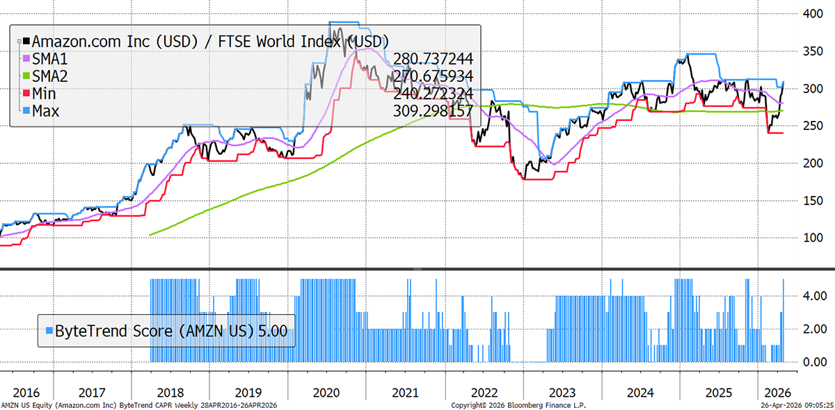 Amazon’s been strong because Amazon Web Services, its cloud division, is accelerating again, with AI infrastructure demand giving the story real power. Investors haven’t always bought into this view, but it has the scale (big CapEx, big backlog) to give it a clear path to turn AI spend into future margin and cash flow. Its retail division continues to perform well, contributing to 12% group growth last quarter.