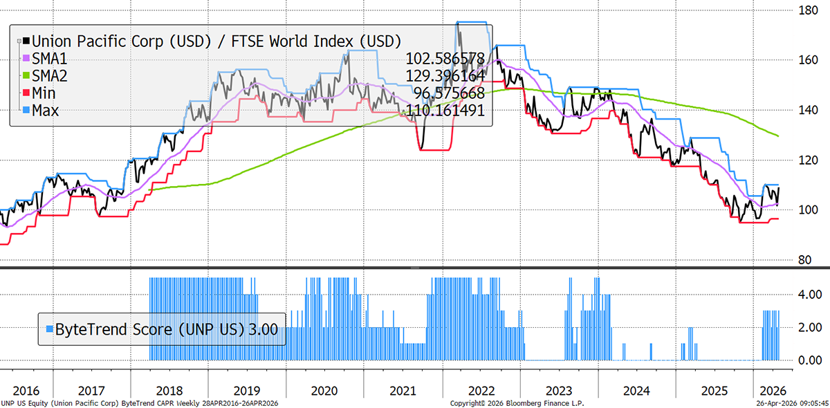 Union Pacific has been strong because investors like the combination of predictable, defensive cash flow, better operating efficiency, and pricing power in a slower-growth market. Additionally, it’s trading close to its price highs, so momentum has also helped push it higher. It habitually adds fuel surcharges to its fees, allowing it to pass on more of the energy cost to its customers than most.