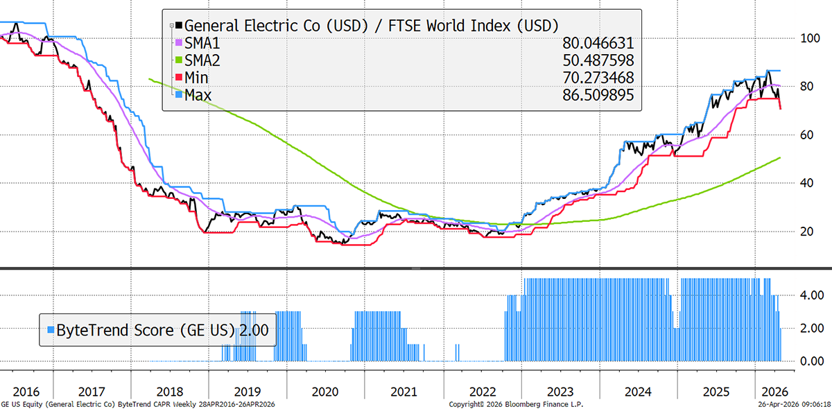 These stocks are trading at the 30-week CAPR lows with a ByteTrend Score above 0. They are weakening trends but not yet downtrends. All charts shown are CAPR rebased to 100.