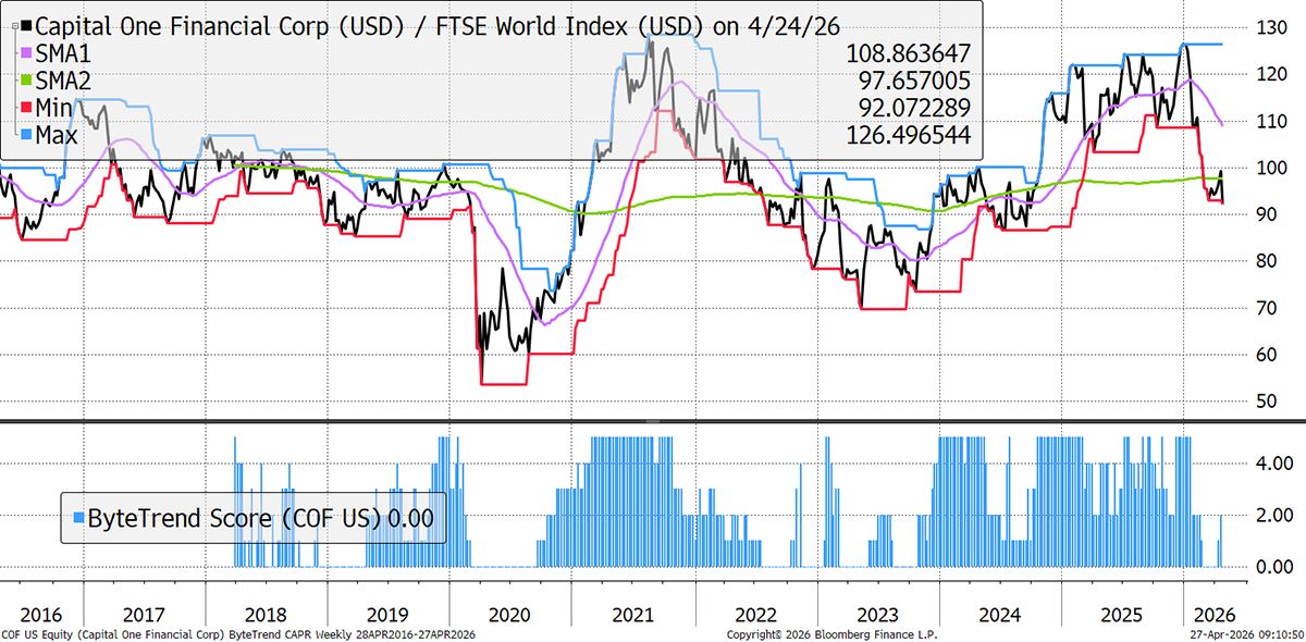 Capital One’s weakness reflects pain in consumer credit. While chip stocks are soaring, the consumer sees little benefit from this at present, fearing for their white-collar jobs, while the energy crisis puts inflation worries back to the fore. Its Q2 results last week showed a slight fall of -2% in revenues, suggesting the integration of its large Discover acquisition is not quite working yet.