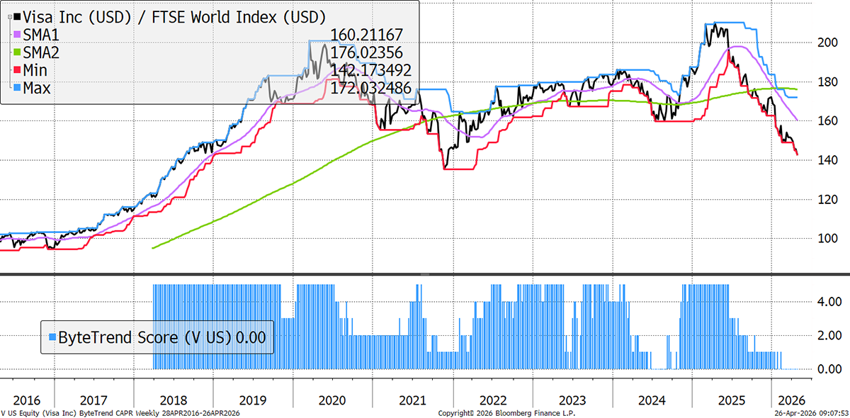 Visa is now in a year-long downtrend. Having reached extreme valuations, the main drags have been talks of US credit-card rate caps, plus periodic worries that AI and payment innovation could pressure fees. It was seen as having an impregnable moat, and the loss of that conviction has been painful for the stock.