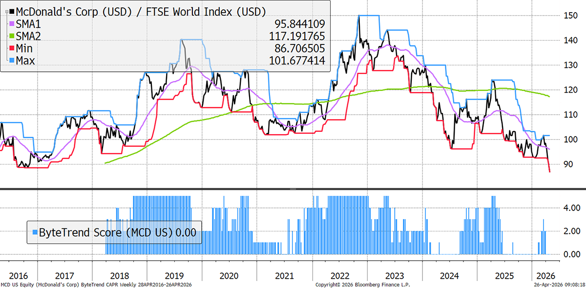 McDonald’s weakened last year due to persistent weak US same-store sales—the worst since 2020 at -3.6% in Q1 2025, as low- and middle-income consumers cut back amid inflation and economic caution. The recent flimsy attempt by its CEO to eat one of their own “products” (burgers) on video hasn’t helped its image, as peers continue to report better results while McDonald’s cuts its forecasts. GLP-1 (weight-loss) drugs are also a growing challenge.