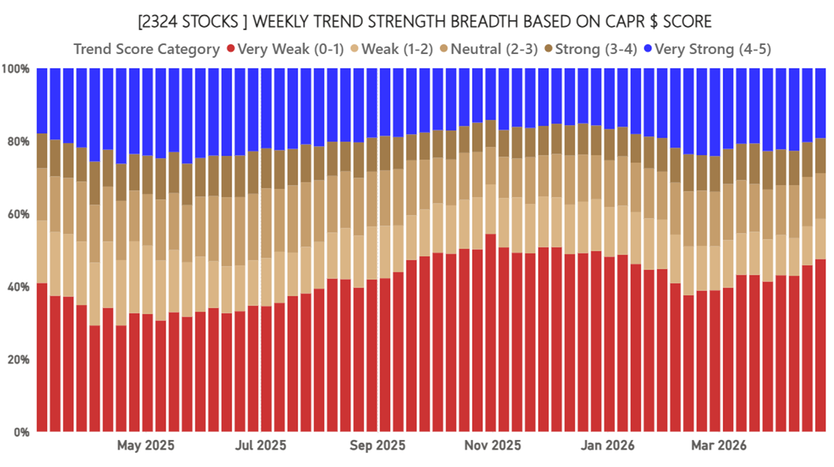 I normally show this chart in local currency to gauge the strength of the market. Breadth is marginally lower than last week. This week, I instead highlight breadth in CAPR. We are back to a market with a few winners and many losers. Notably, 47.5% of all stocks are in relative downtrends, and just 19.5% in uptrends, making this market hard to outperform. Alpha opportunities are thin. I suspect it was like this in 1999.