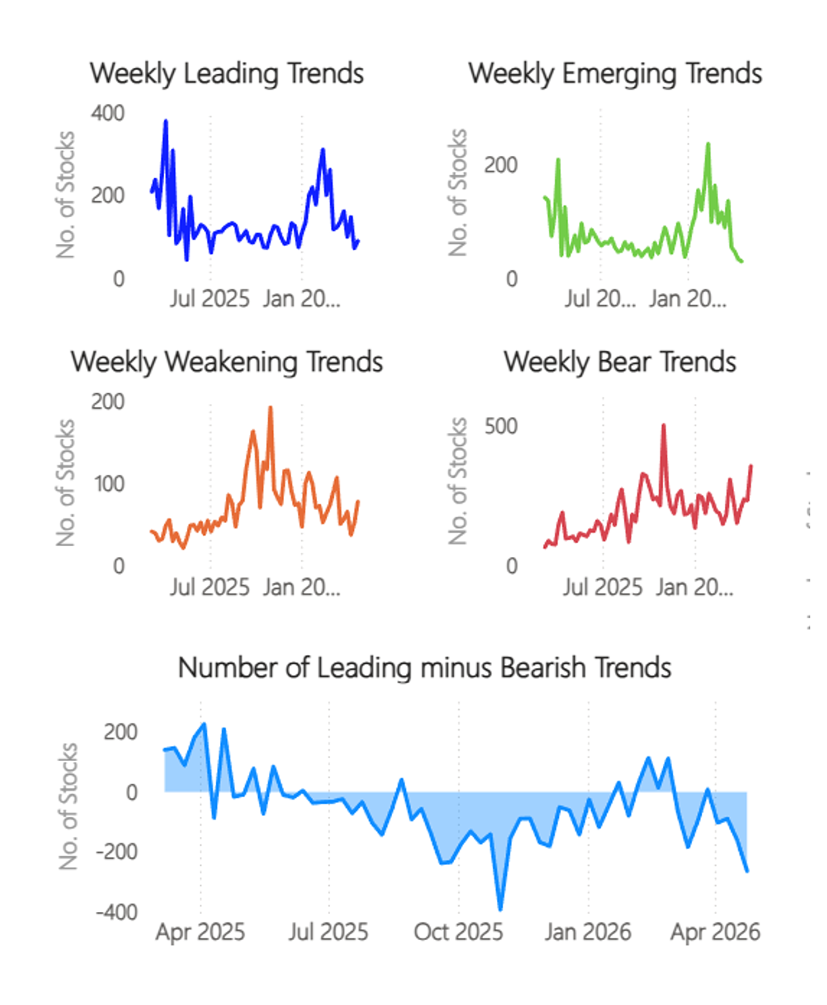 I can make that same point another way. There are a few leaders and many bear trends. The lower blue chart shows this as a timeline.