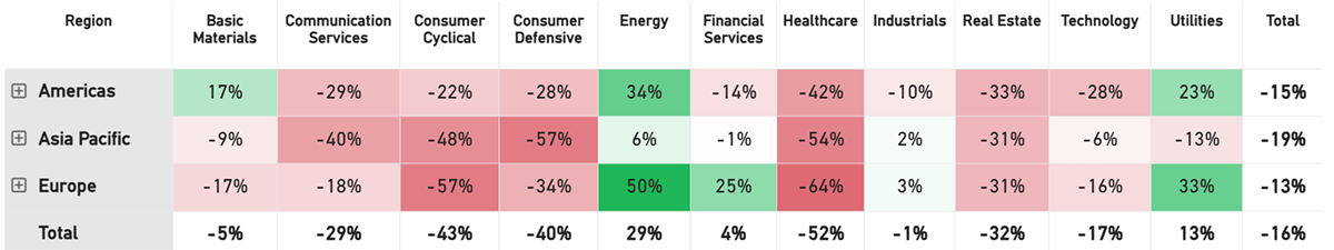 Energy has improved, and Technology Hardware remains strong. Software remains weak. Healthcare and Life Sciences nosedive alongside Retail, Autos, and Home & Lifestyle.