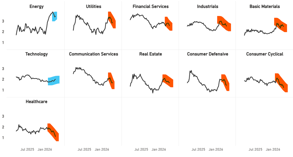 Just Technology and Energy show improvement, with all other sectors worse off. The Consumer and Healthcare are particularly weak.