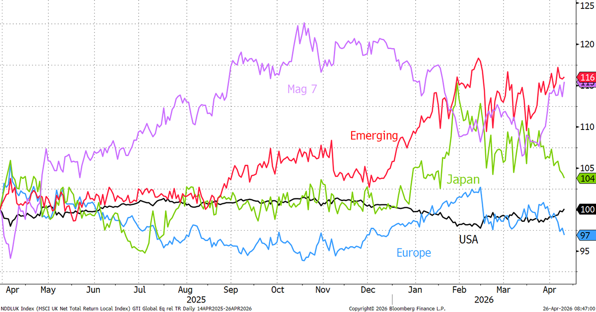 The USA is back, especially the big tech stocks. Europe and Japan fade, while EM holds.