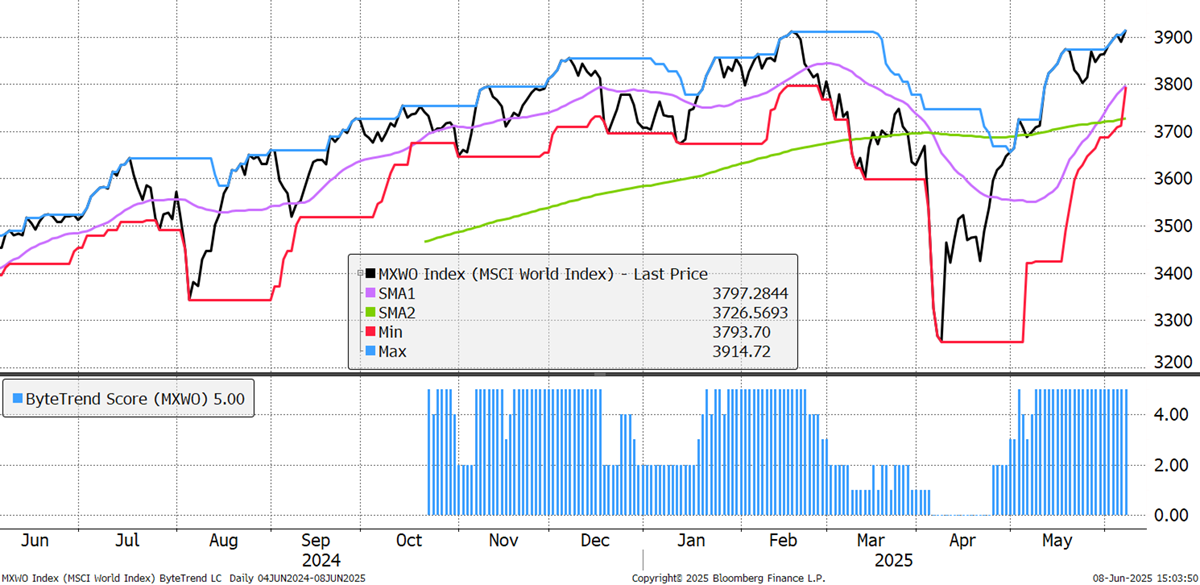 The world index makes an all-time high, maintaining a ByteTrend score of 5 on the daily chart. This is bullish.