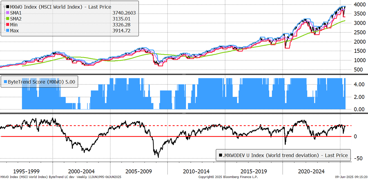 With all-time highs, it is worth keeping an eye on the deviation from the trend shown over the past 30 years. The world index weekly chart also has a ByteTrend score of 5. The price is currently 25% above the 200-week trend, which is headed for overbought territory. There is no cause for concern this week, but it is something to keep an eye on.