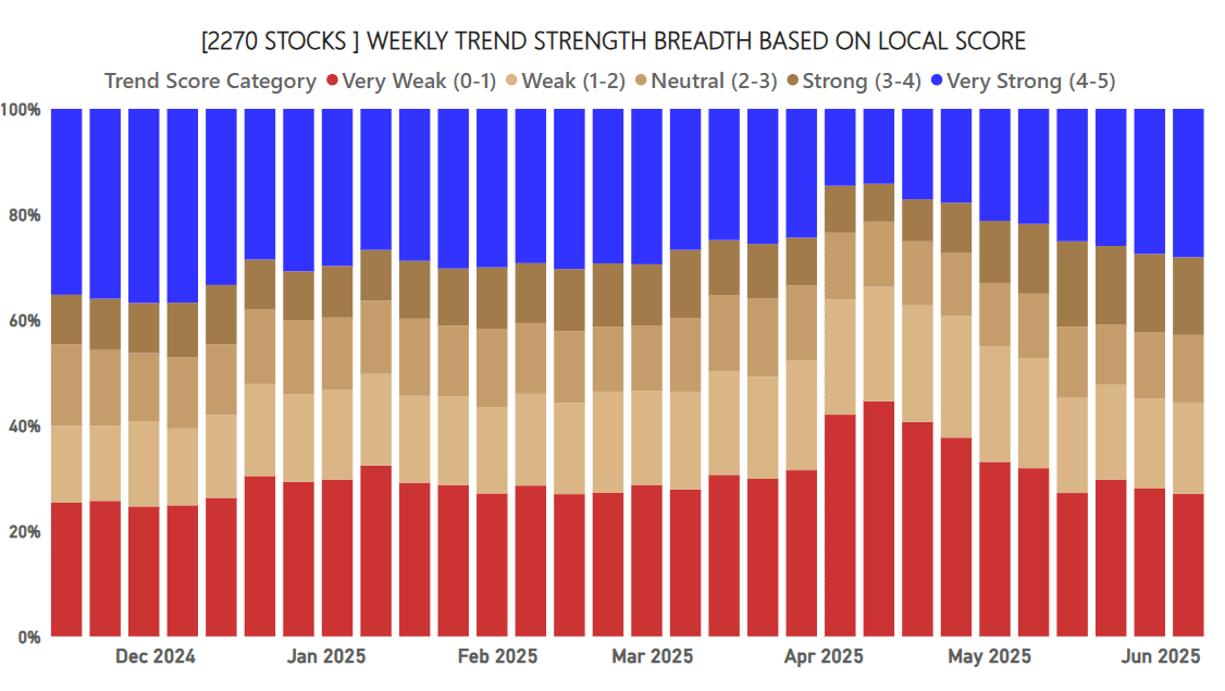 Market breadth (number of stocks in strong vs weak trends) continues to improve.