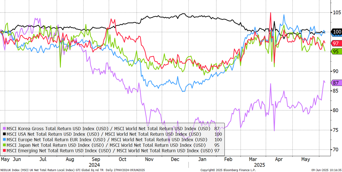 The regional CAPR chart shows Japan (green) as sluggish last week, with other major markets neutral. This week’s special guest is Korea. It’s an interesting situation with several leaders and emerging trends in finance and industry, but nothing on the bear side. Following Trump’s election victory, the Korean market sold off sharply last year but is staging a comeback.