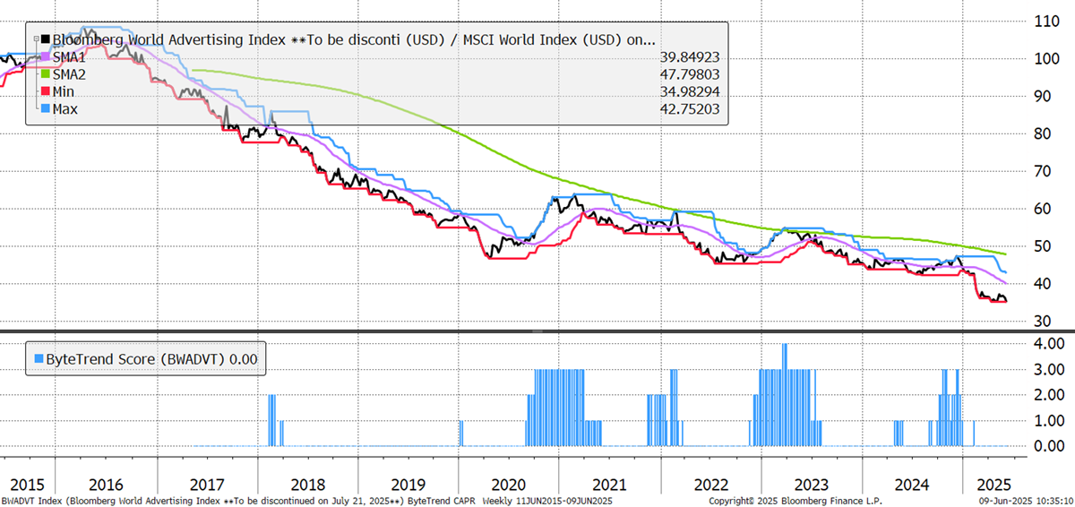 For regular readers of GTI, it is striking how many companies show up week after week, which demonstrates the power of trend following. We note in the bear section that the advertising industry shows up. It’s a disaster, and today’s FT reports that WPP’s CEO has quit.