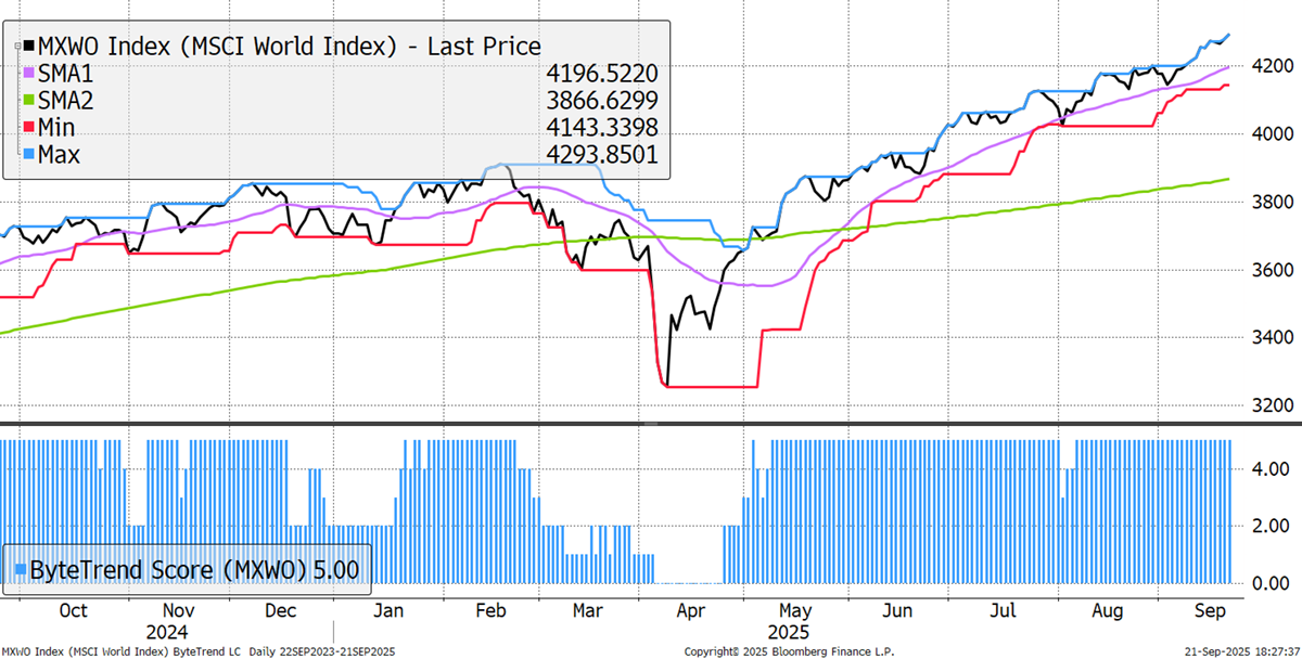 The World Index powers ahead again, maintaining its ByteTrend Score of 5. It’s bullish, and still not heavily extended in the big scheme of things.