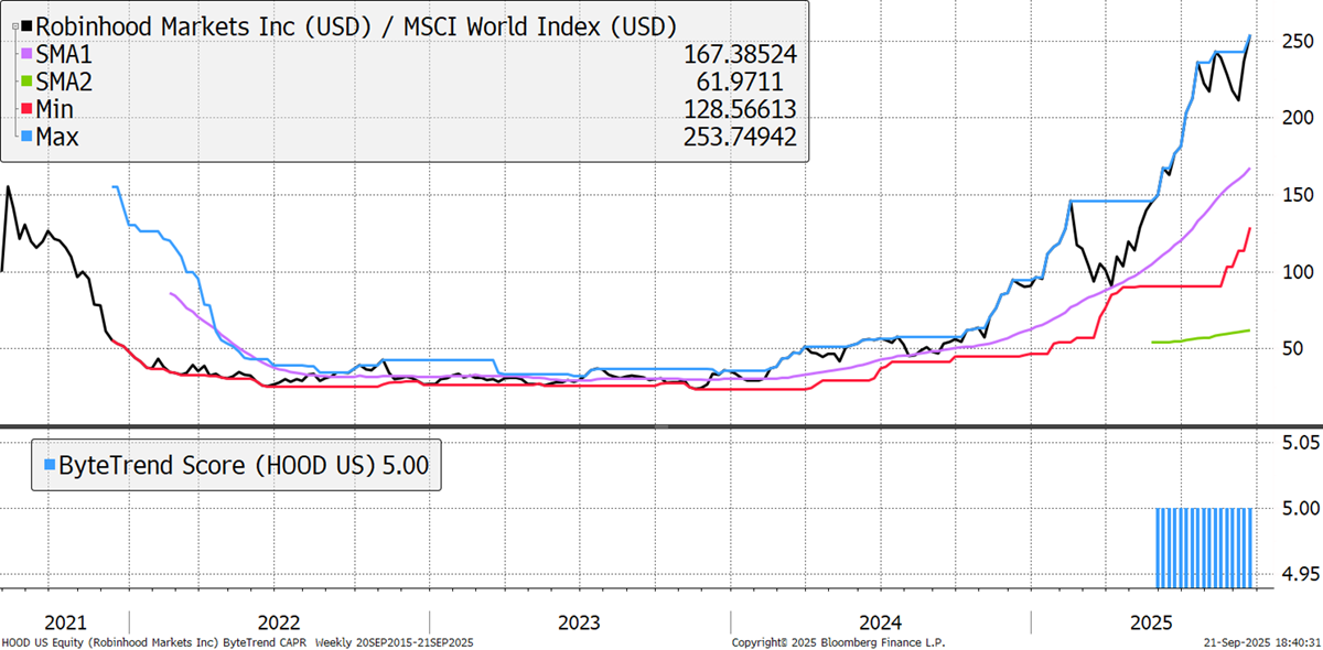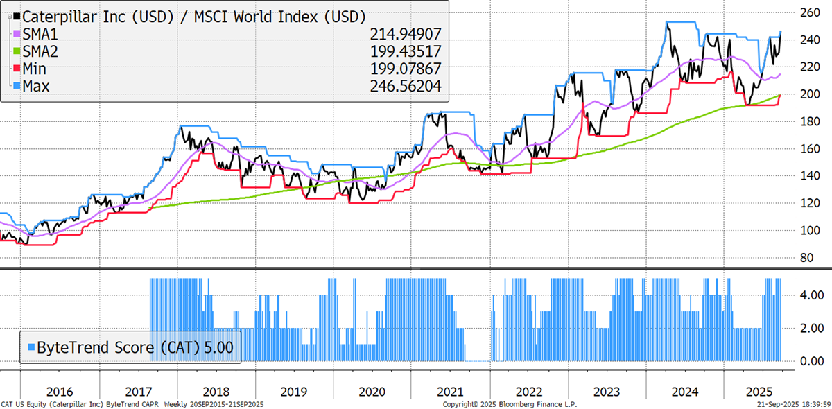 These stocks are trading at the 30-week CAPR highs with a ByteTrend Score of 5. All charts shown are CAPR rebased to 100.