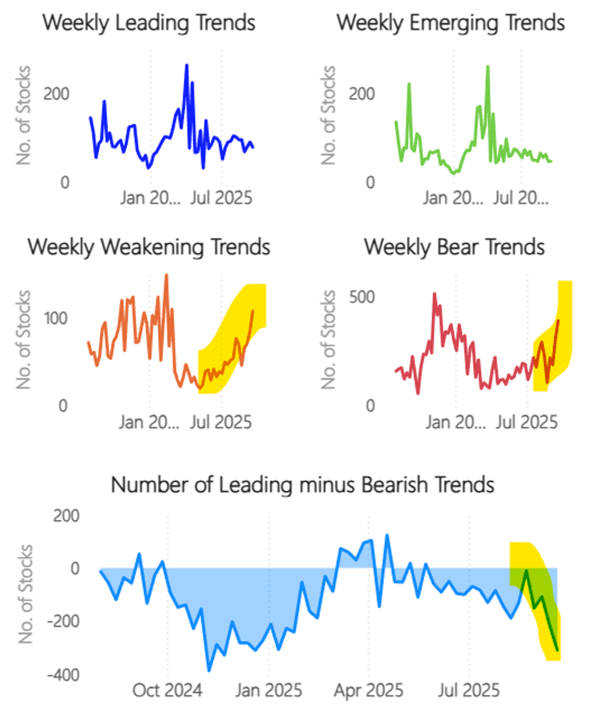 But under the surface, we can see some cracks are appearing as the number of bullish leading and emerging trends is holding steady, while the number of more concerning weakening and bearish trends spikes. Net-net, there are more bearish trends, i.e., stocks underperforming the World Index rather than beating it. Another fine addition to the spreadsheet, courtesy of Rashpal Sohan.