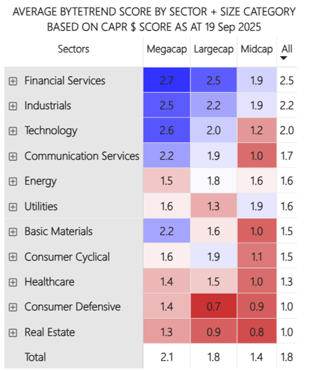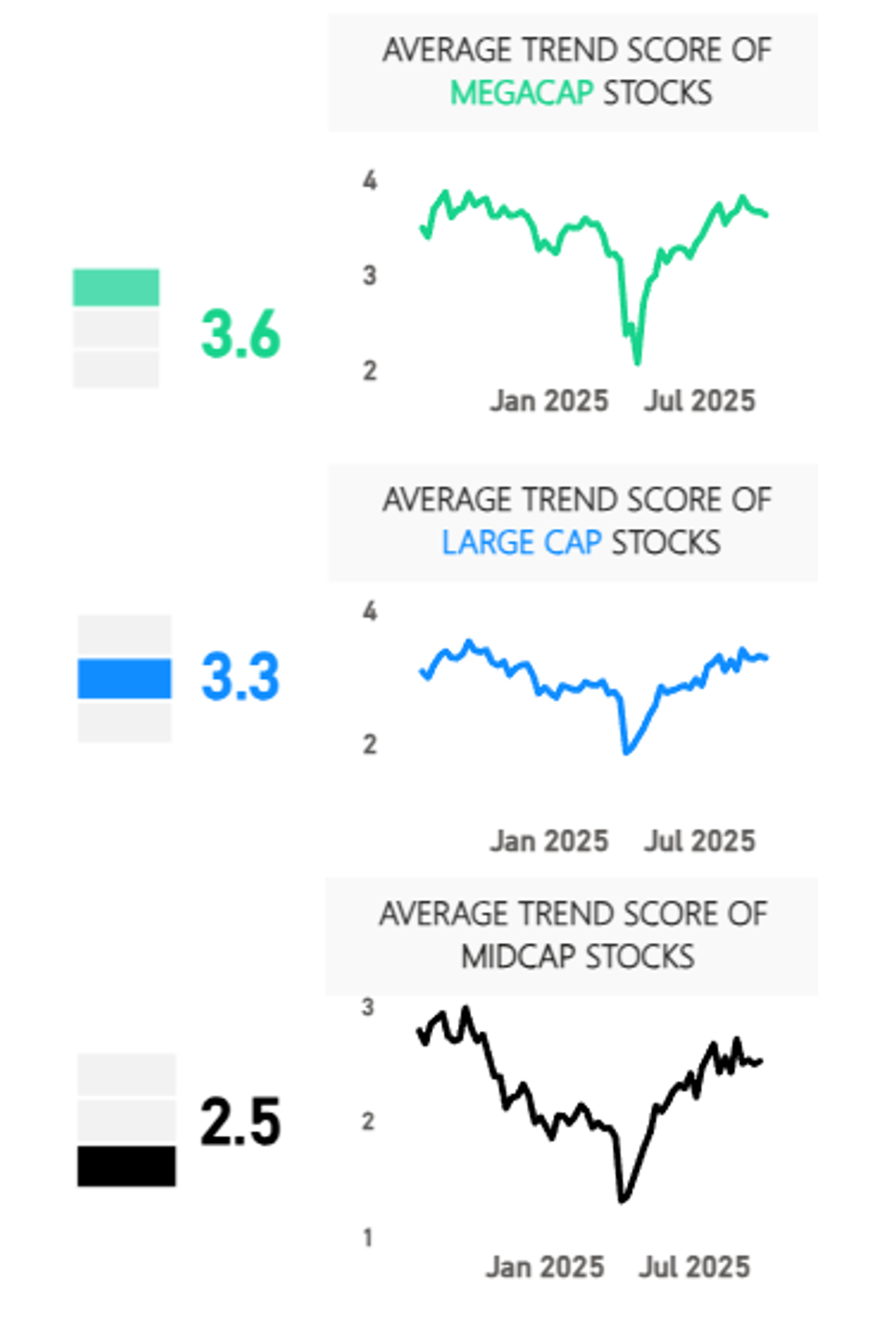 We show the same data numerically, where mid-caps are a long way behind mega-caps and large-caps.