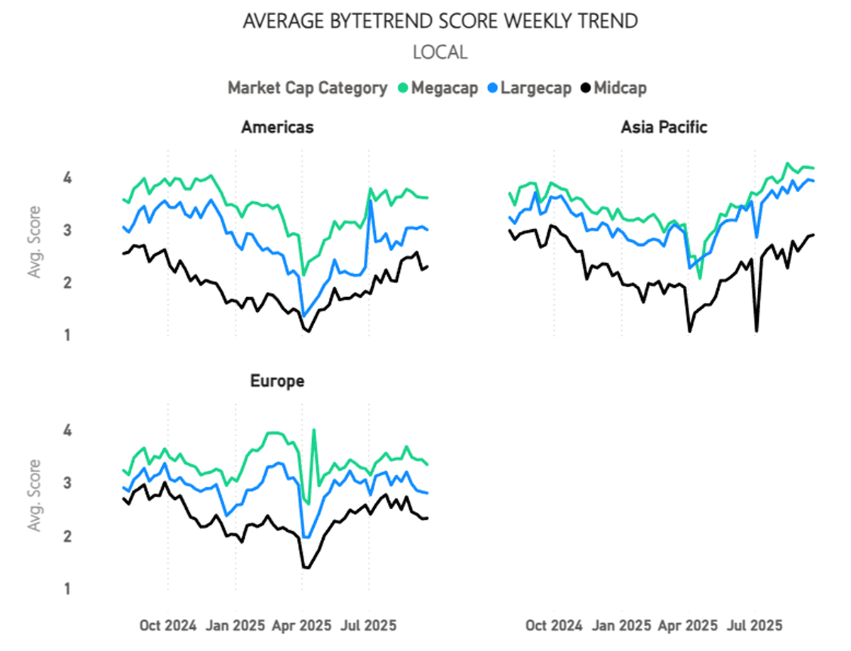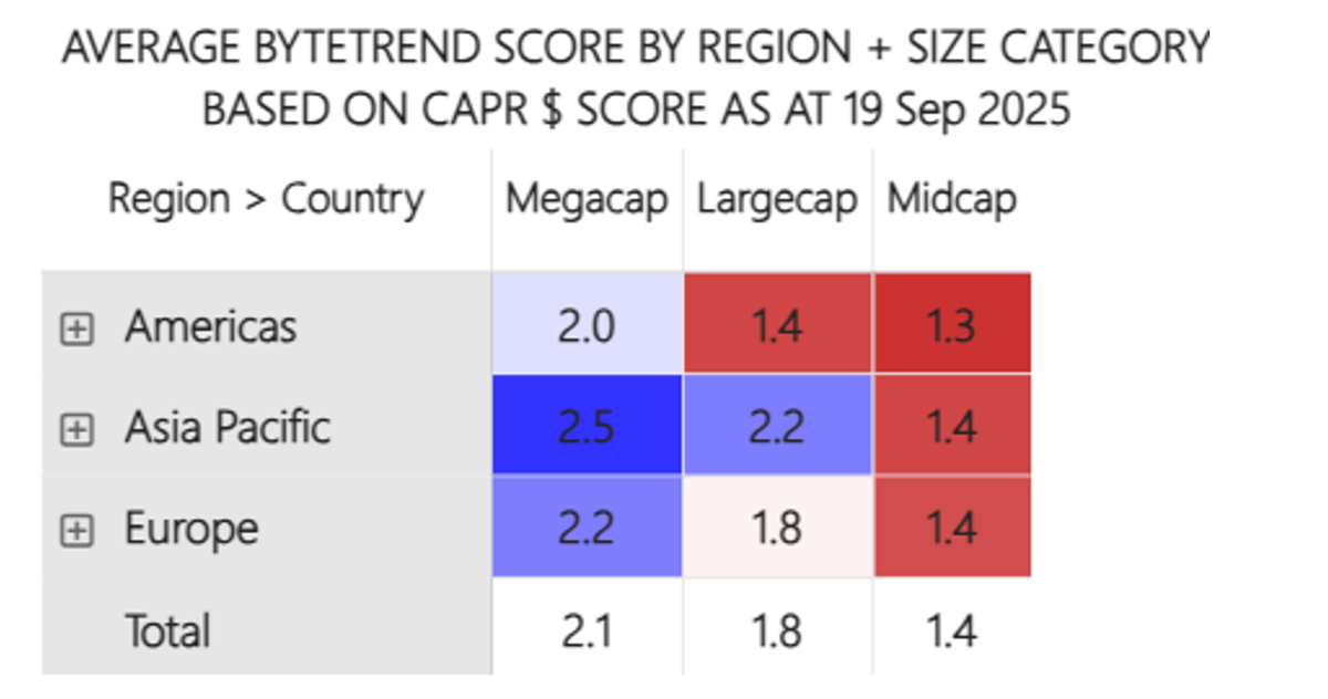 The total market cap of the 2,500 (ish) stocks we cover comes to $111 trillion. We have split it into three groups, each with $37 billion of combined value. The top 33 stocks are the mega-caps, the next 288 are large-caps, and the remaining 2,147 stocks are mid-caps. That is an extraordinary split, with the mega-caps leading the large-caps, which are leading mid-caps in every region. To be absolutely clear, this is not normal, as the mega caps are normally laggards, just not during an AI frenzy.