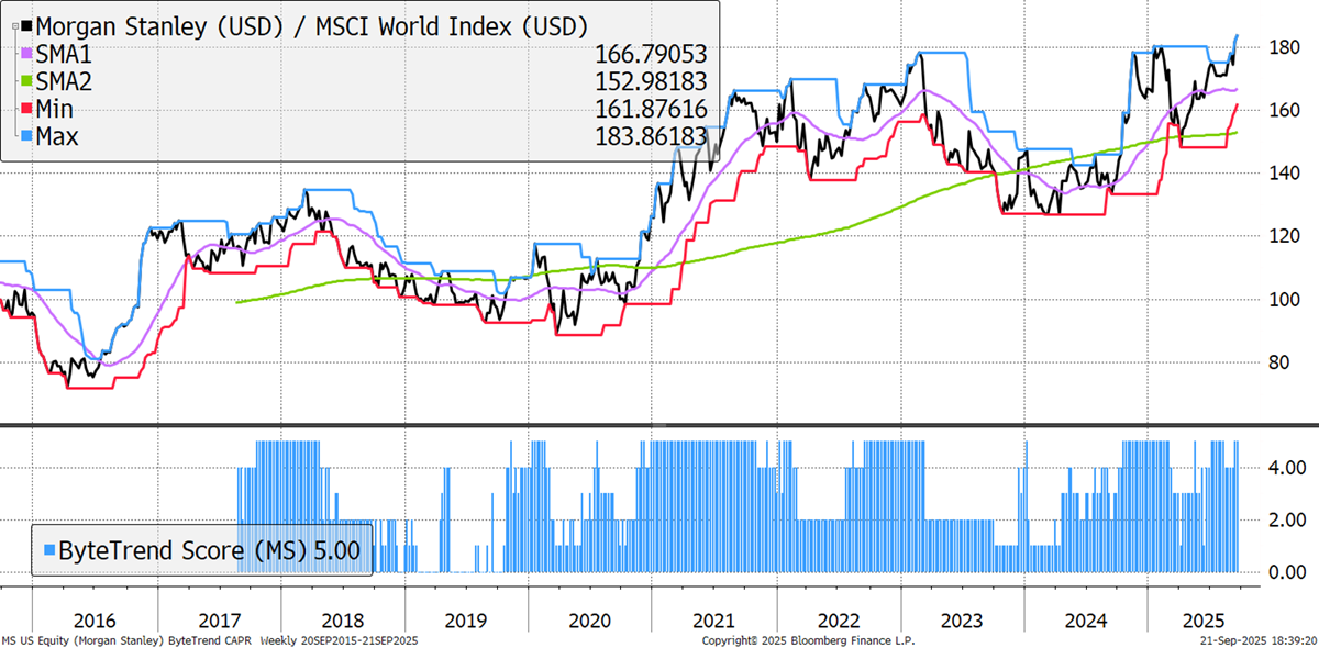 This is Morgan Stanley’s second week as a 5. The global investment bank’s performance in 2025 has been bolstered by strong earnings results, steady revenue growth from its wealth management, investment banking, and trading divisions, and continued cost management. It has benefited from expansion in wealth management and advisory services, which drive recurring revenues. Its Price/Book ratio is back to pre-2008 levels and double its post-crash average.