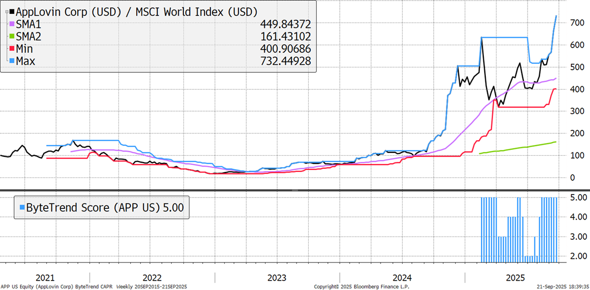 Advertising software company AppLovin is set to join the S&P today. That is often a case of buy the rumour, sell the news, and the first part has certainly come true as investors have piled in at speed. Revenue growth of nearly 100% and net income of 150% are extraordinary numbers. Analyst price targets are up 5x in the last twelve months alone. Valuations are extreme, but so is the growth, giving it a 360-day volatility of 92, which is extreme.