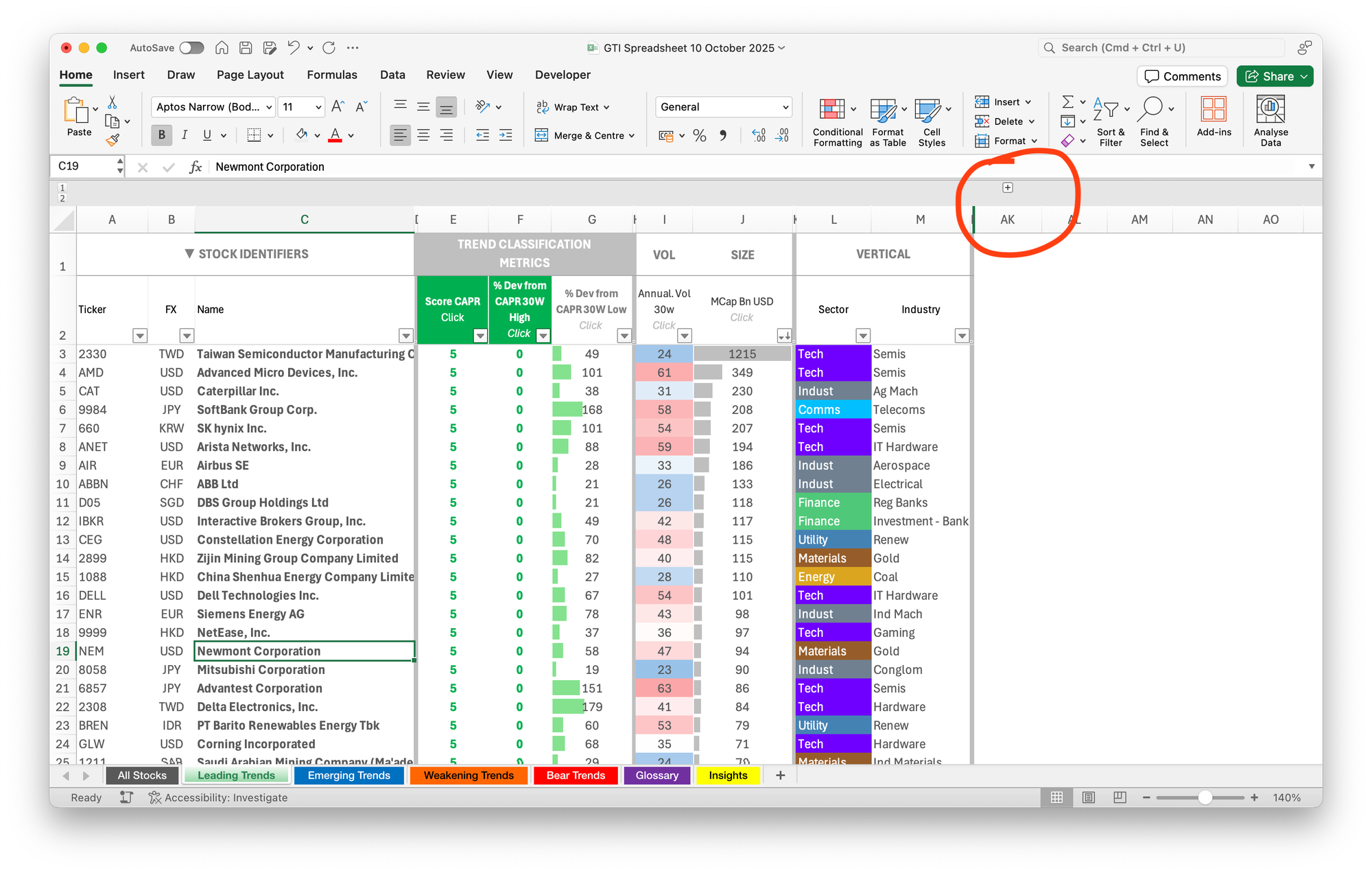 This is how the Leading Trends tab in the spreadsheet looks when you open it.