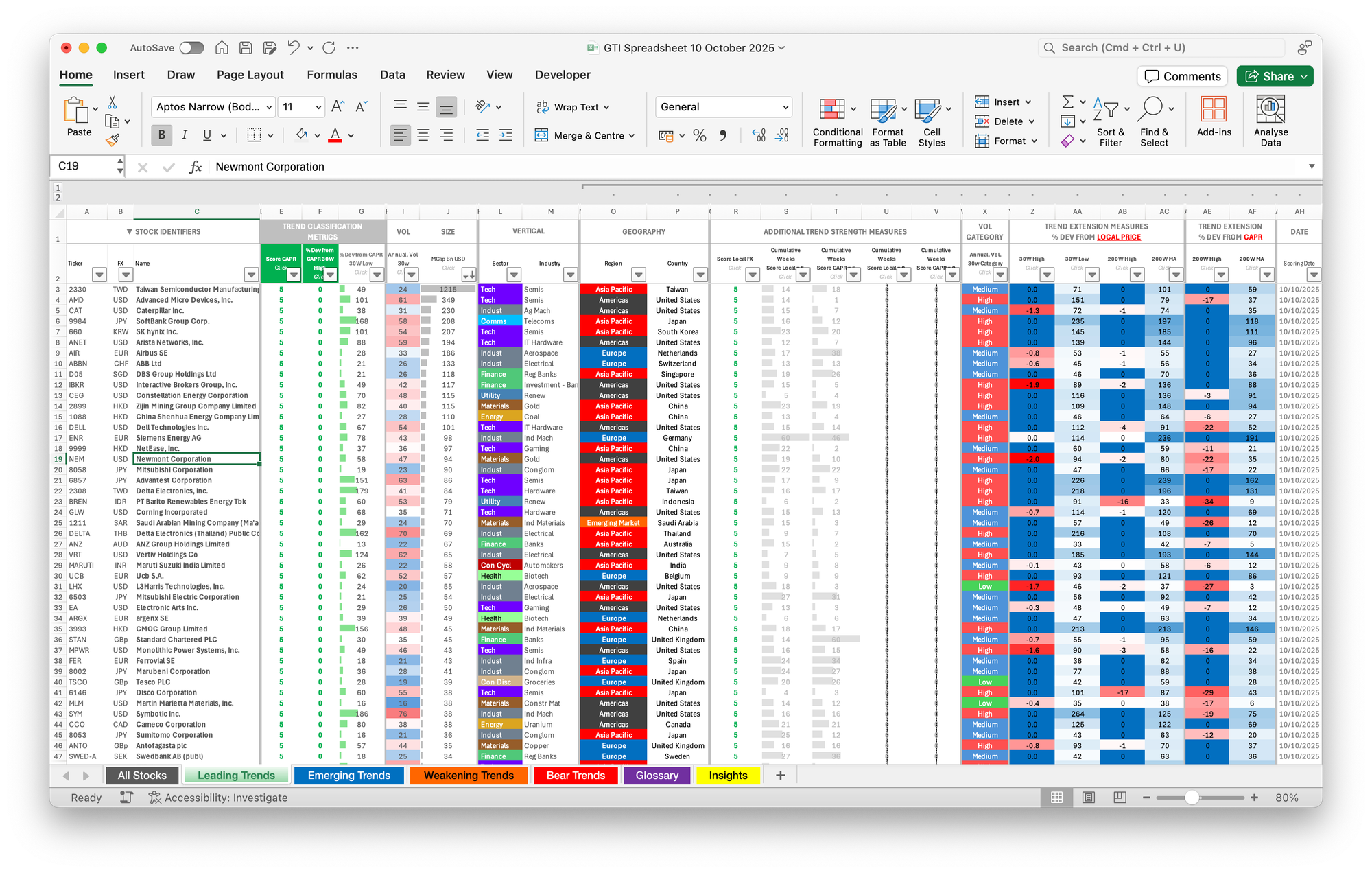 The free GTI 200 spreadsheet and paid GTI Premium spreadsheet (2,500 stocks) are delivered to clients in Excel format.