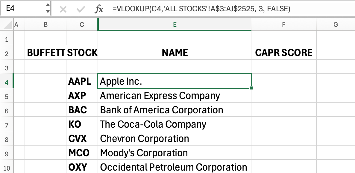 =VLOOKUP(C4,'ALL STOCKS'!A$3:AJ$2525, 3, FALSE)