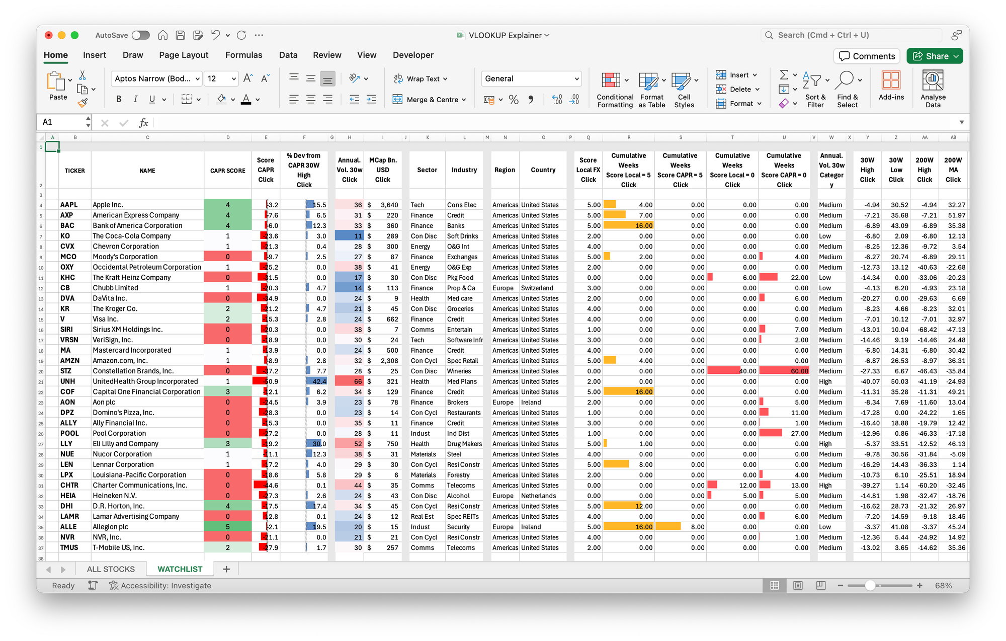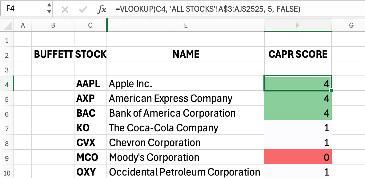 The best way to do this is with a VLOOKUP function on Excel, which can allow you to simply and easily update CAPR scores and trend data for all stocks of interest every Monday.