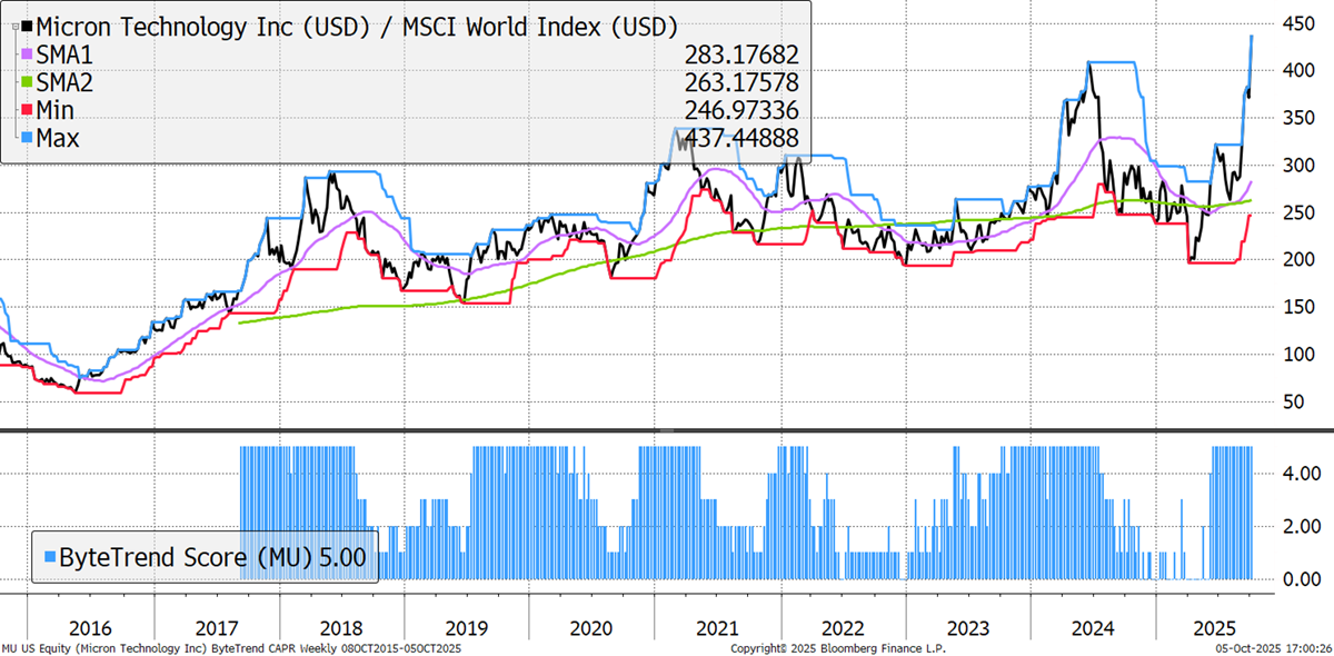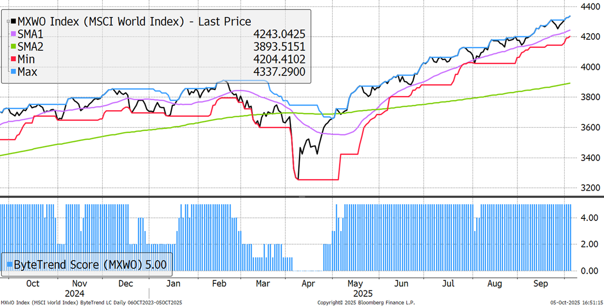 The World Index seems to be unstoppable, maintaining its ByteTrend Score of 5 with only a brief interruption since May. It is still not particularly overbought.