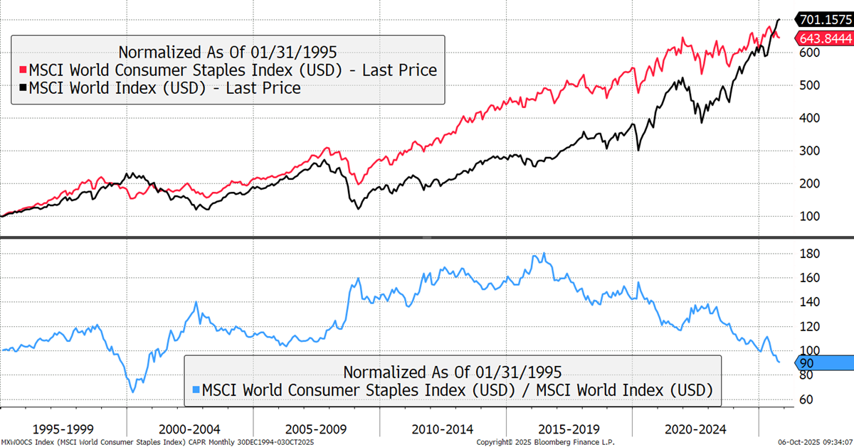 Consumer staples lagged the market in the roaring 1990s technology boom, and then again ahead of the financial crisis. This time they have lagged since 2016 and appear to be out of favour like never before. Another contrarian buy ahead of the market turn – whenever that comes.