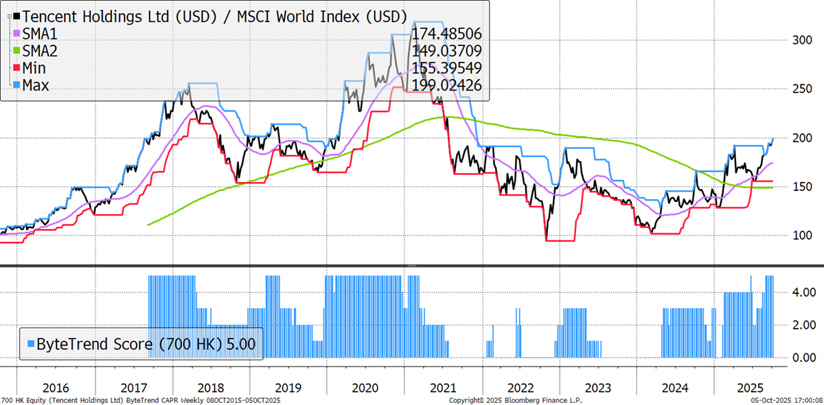 Tencent is up over 50% this year, driven by growth in gaming, AI advertising, cloud services, and fintech. It’s investing heavily in AI-integration across its platforms and remains a market leader in video and music. It suffered from broader Chinese weakness in 2022/23, with quarterly revenues briefly falling, but it has steadily returned to double-digit growth ever since. It reached its lowest valuation multiples in this period, but these have since normalised.