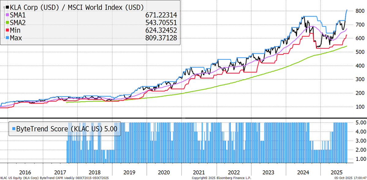 Semiconductor equipment manufacturer KLA Corp has enjoyed a strong decade of outperformance, driven by high growth and returns on capital of 30-40%. Everyone always talks about TSMC, but KLA has outperformed it since just before the pandemic. After revenue growth turned negative in 2024, it suffered a dip, but growth has returned to over 20% in the last three quarters, explaining its return to form.