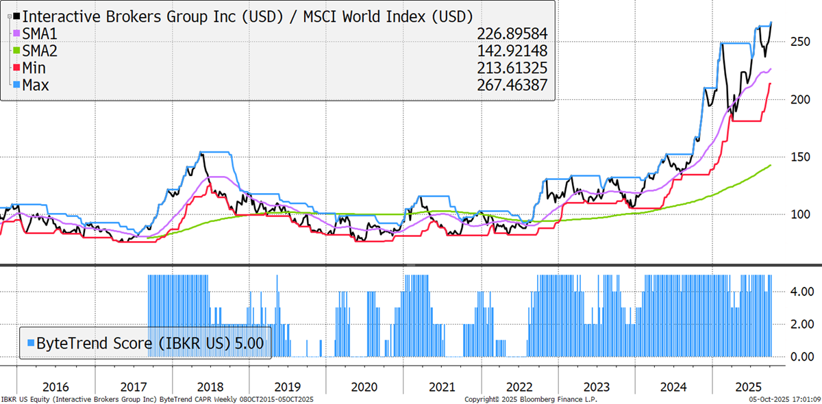 These stocks are trading at the 30-week CAPR highs with a ByteTrend Score of 5. All charts shown are CAPR rebased to 100.