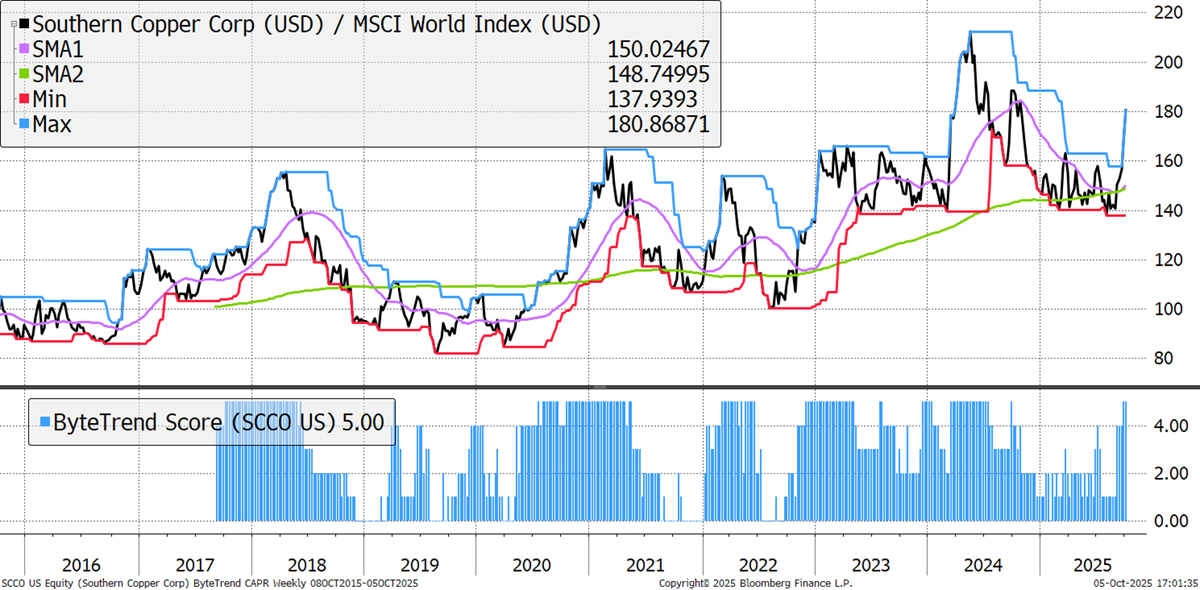 The brief tariff shock in the summer tanked the copper price, but it’s back on the rise and reapproaching all-time highs. Inflation round two incoming? Southern Copper is one of the world’s largest producers with huge operations in Mexico and Peru. Majority-owned by Grupo Mexico, it also produces zinc, silver, and molybdenum (used to strengthen steel for aircraft, vehicles, and industrial uses).
