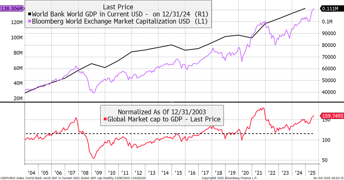 We highlighted the chart below in the recent Multi-Asset Investor Quarterly Review. The market cap to GDP ratio is said to be one of Warren Buffett’s favourite market valuation measures. There can be no doubt that we are entering a period of high valuations.