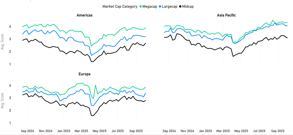The other risk to the index would be a deterioration in the mega-caps, which have led this rally. In all regions, the mega-caps lead the large-caps, which lead the mid-caps. At some point, this will change, and the thought is that the mid-caps may provide sanctuary.