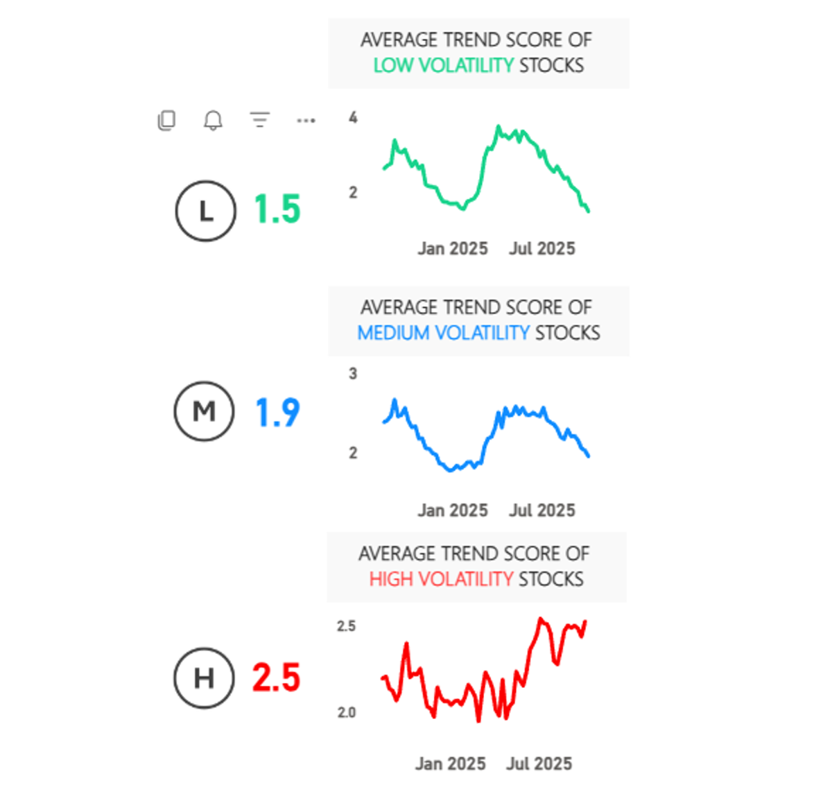 Volatility also stands out. Low volatility stocks, normally the safest, are lagging the market quite severely. Medium volatility stocks are also lagging, while the market is being led by the most volatile stocks.