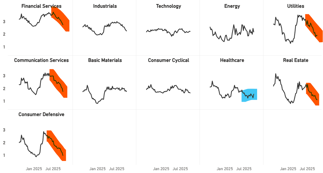 Technology is the most stable sector when measured in currency-adjusted price relative (CAPR) terms. Financial services are weakening from a position of strength. Utilities, communications, real estate, and consumer defensives are also weakening. Healthcare is the standout bull case this week, having been weak over the summer. Energy, highlighted last week, may have seen its worst.