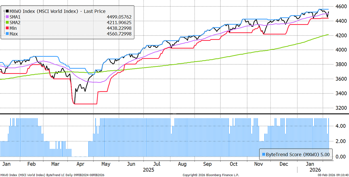 The World Index retains a ByteTrend Score of 5 in USD, having dipped two points on Thursday. This is a Teflon market.