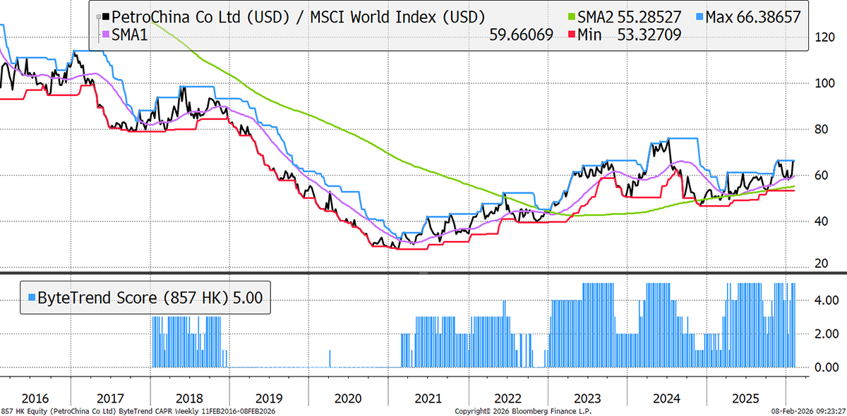 A steady five-year outperformance is not what you would expect from PetroChina, given the weak oil price of recent years. State-backed, it makes hefty dividend payments, while domestic gas demand has grown at 10% annually. It also has no qualms about profiting from refining discounted Russian gas, putting it at an advantage over Western rivals.