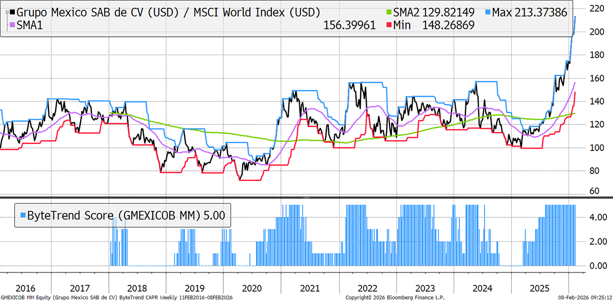 Results in January showed revenues grew 12%, with rising margins, driven by all divisions at Grupo Mexico, a leading Mexican conglomerate focused on mining. As the 90% owner of Southern Copper, it is one of the world’s largest producers, and with AI and electrification, demand growth and supply shortage fears are driving its price higher.
