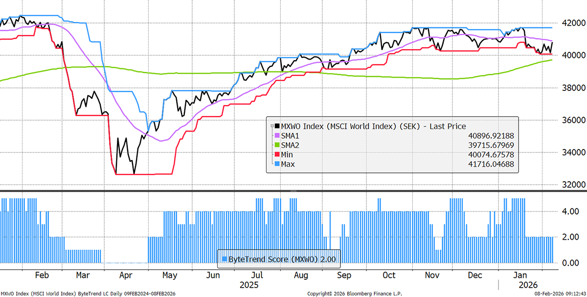 To illustrate the importance of the weak dollar, I show the world in SEK, the strongest currency over the past year. The ByteTrend Score drops to a 2, highlighting that the tailwind is achieved by measuring the trend in a weak currency.