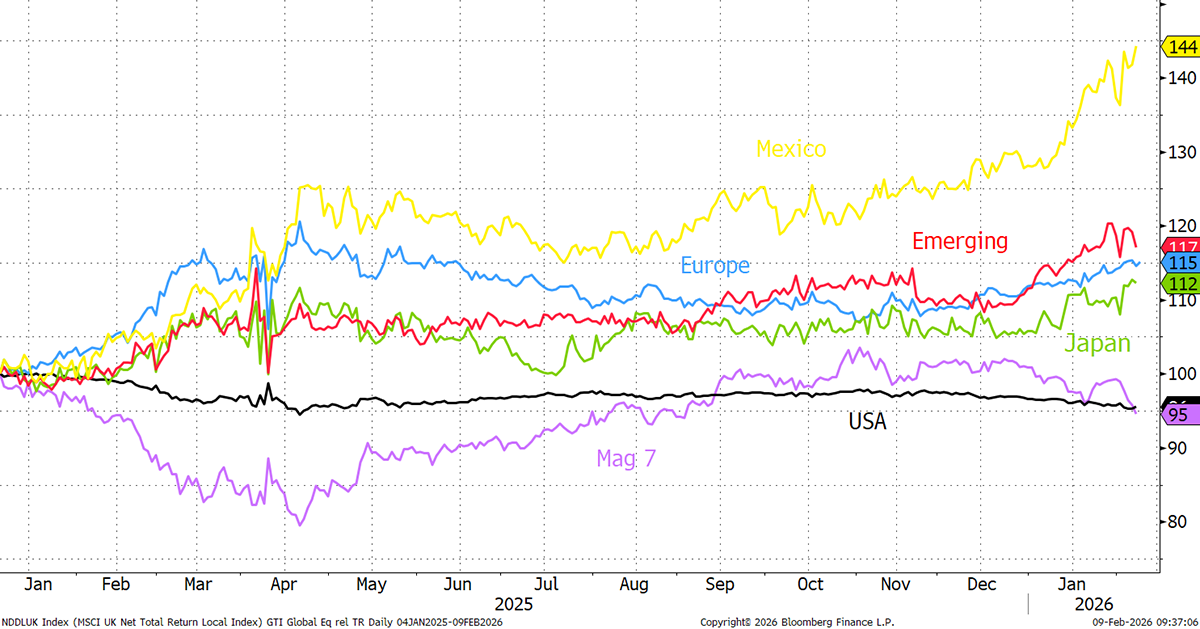 Over the past year, Emerging Markets, Europe, and Japan continue to lead. The US and the seven largest technology stocks now lag. Mexico is riding high.