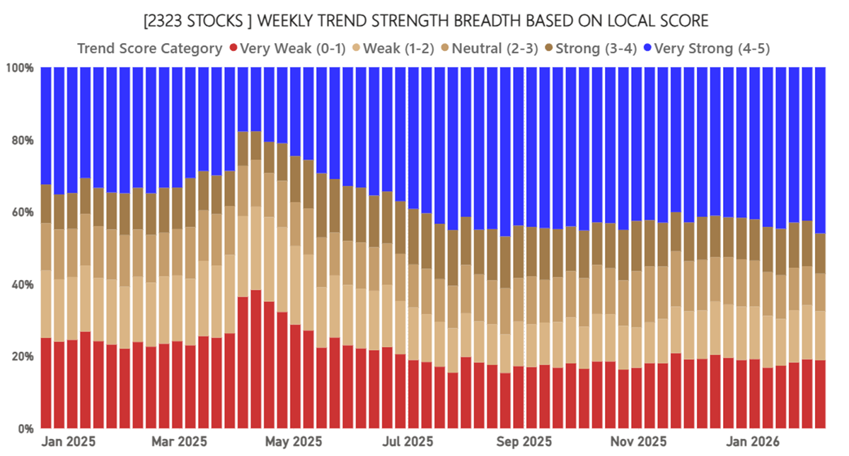 Despite the shake-out in the technology sector last week, global breadth increased, which is remarkable. Notably, 55% of stocks are in price uptrends.