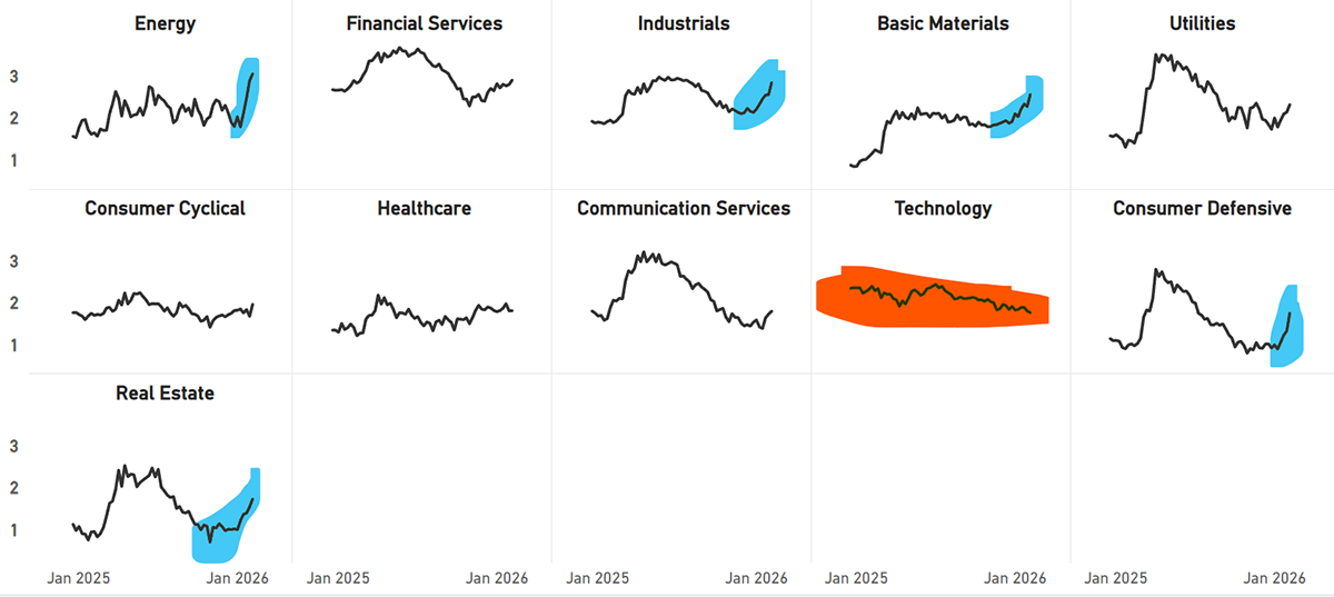 Energy, Industrials, and Materials are strong, and have recently been joined by Defensives and Real Estate. The remaining value in this bull market is finally being unlocked. Tech is weak.